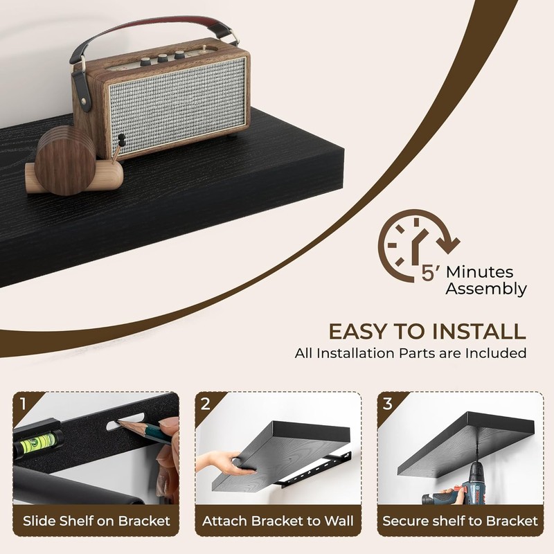 - Easy To Assemble: This floating shelves not only come with stainless-steel galvanized invisible brackets, but also equipped a fixing screw at the bottom to fix the shelf on the support rod, which solves the problem of sliding and is not easy to damage, and can be used for a long time. Instructions, magnetic level, drywall anchors, and screws included. This is great because you can easily mount these rustic shelves Gap-Free to any surface in less than 10 minutes