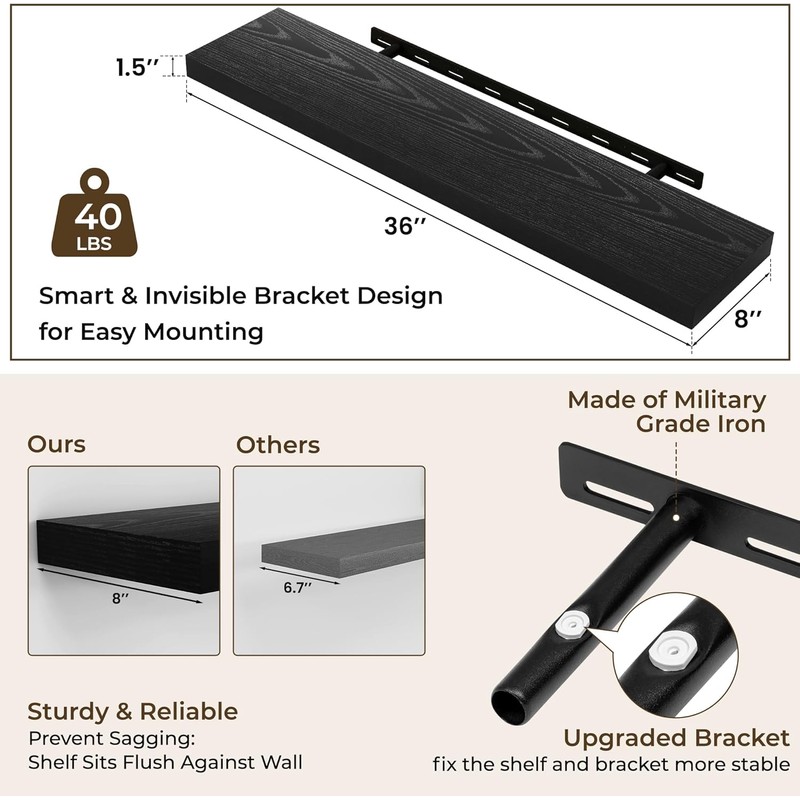 - 36 Inch Floating Shelves for Wall (Set of 2): Each wall shelves are 8 inches in depth and 1.5 inches in thickness. 2-piece set is more cost-effective and practical. Our wall shelf can be used in combination, staggered high or low on the wall, or mounted side-by-side to provide extra storage space for organizing small items and clutter in multiple areas such as kitchens, bathrooms, and bedrooms, creating a clean and smooth look. Multiple colors available