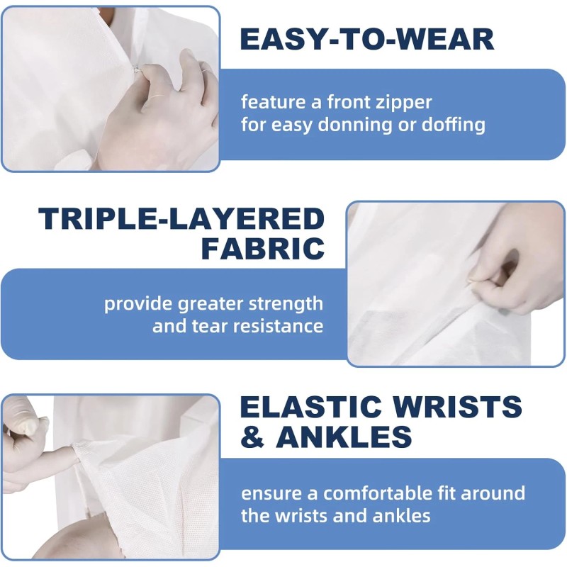 - Secure Fit: The coverall features a convenient front zipper for easy donning and doffing. Elastic knit cuffs provide a snug fit, effectively preventing the entry of dust and particles. Elasticized ankle edges with double-layer sealing ensure a secure, all-encompassing seal.
