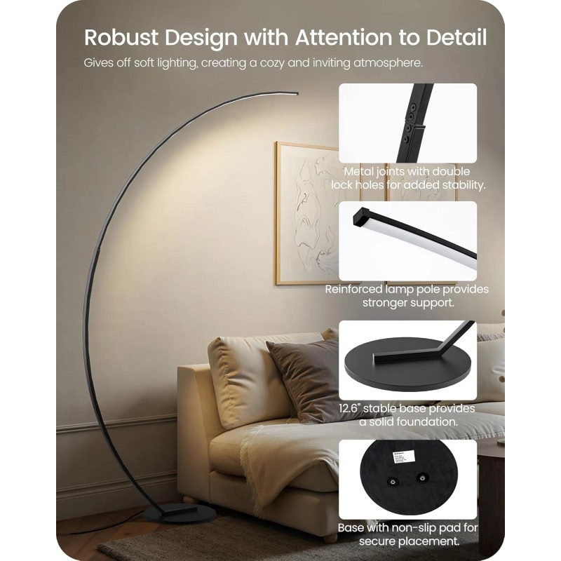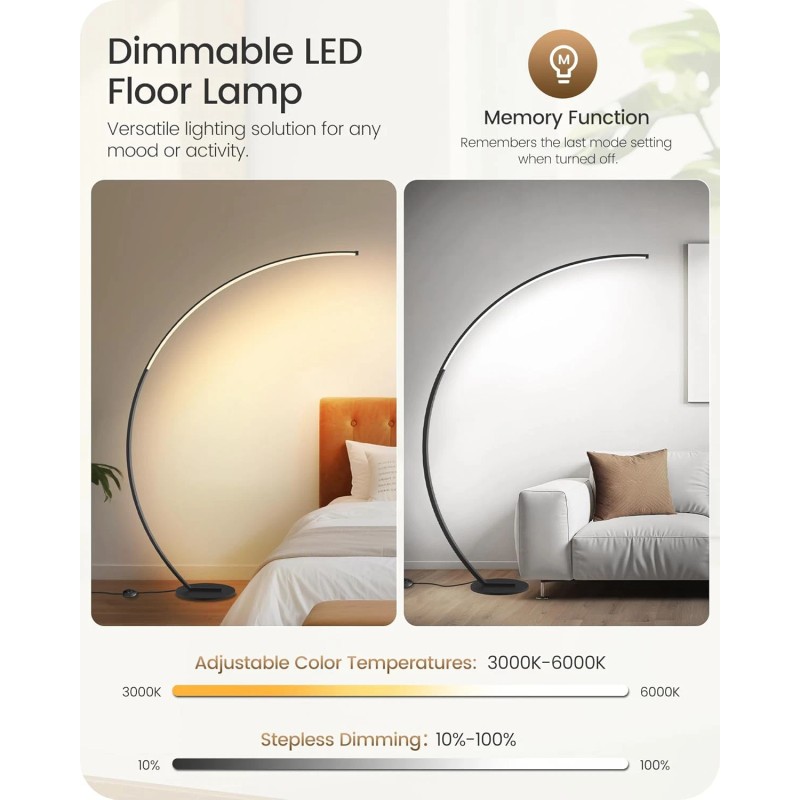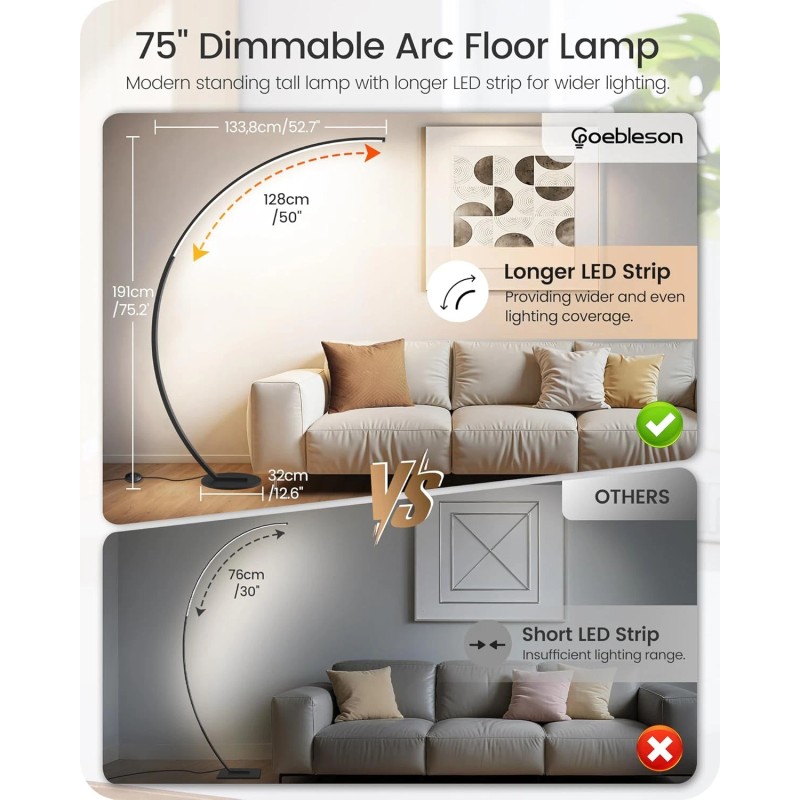 - Elevate Your Space: Our 75 inch dimmable LED floor lamp is sleek and modern to fill gaps in living rooms, bedrooms, and home offices. The 12.6" non-slip base ensures unwavering stability. Whether placed singly in a corner or symmetrically in pairs, this arc floor lamp enhances your decor with timeless elegance