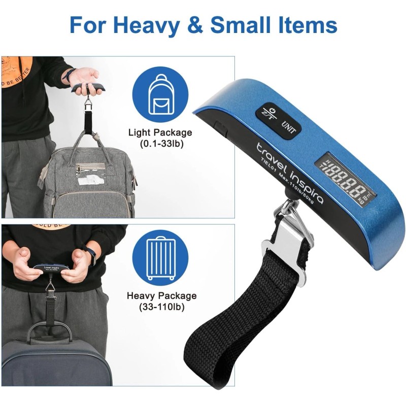 - [Capacidad máxima de 110 libras] La báscula de viaje tiene una capacidad de peso de 110 libras/50 kg, lo que te permite usarla incluso para esas maletas de gran tamaño. Graduación de la báscula electrónica portátil: 0,1 libras/50 g. La báscula electrónica para maletas pesa 3,5 onzas, es pequeña y cómoda. No se necesita espacio adicional para comenzar tu aventura.
