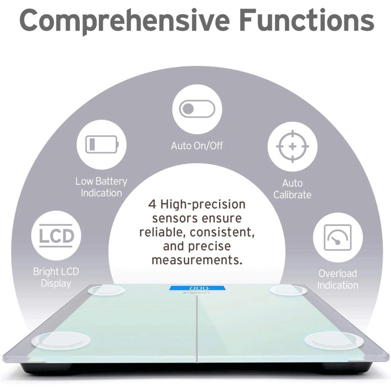 - Precisión constante: la báscula de baño está equipada con 4 sensores de alta precisión que proporcionan incrementos de 0,1 lb/0,05 kg.