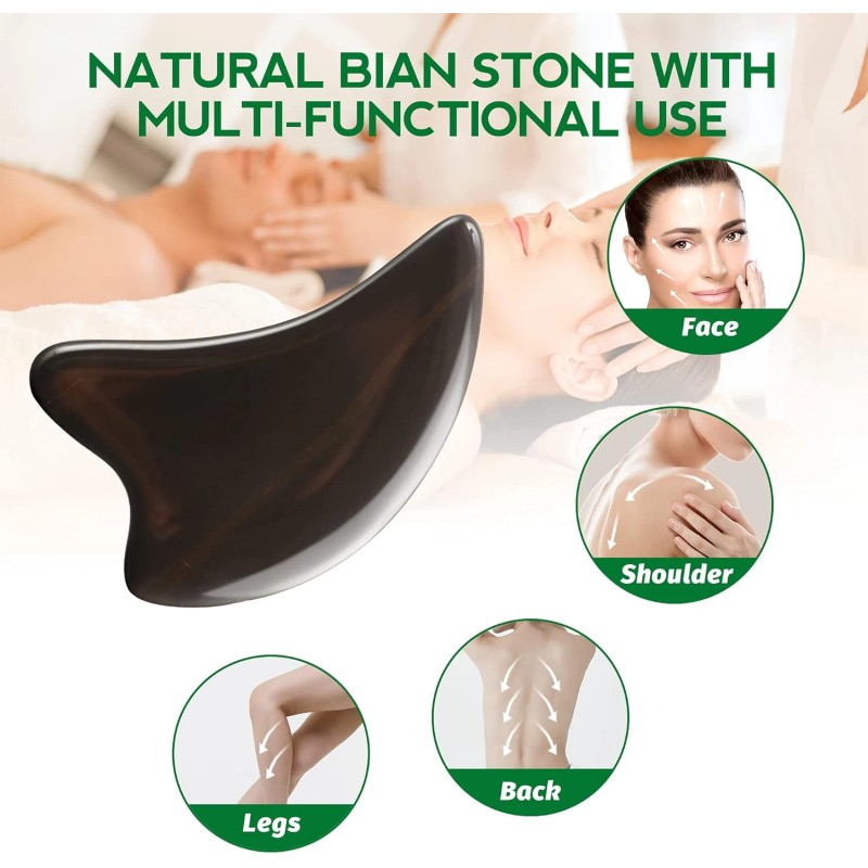- Gua Sha with Bian stone is benefit for many ailments such as muscle & joint pain, scar tissue, stress or reducing facial wrinkles,make the skin smoother and brighterIt.It usually used as a massage or cosmetic tool.