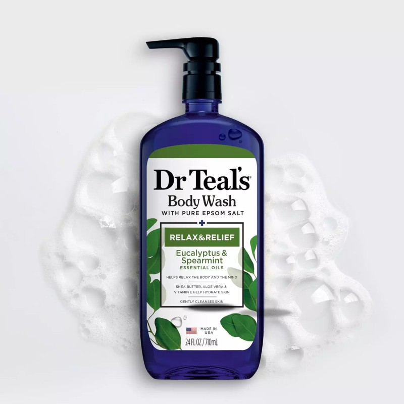 - Apply a generous amount of Dr Teal’s body wash to hands, washcloth, or pouf, then gently massage all your body for ultra-moisture and total rejuvenation.