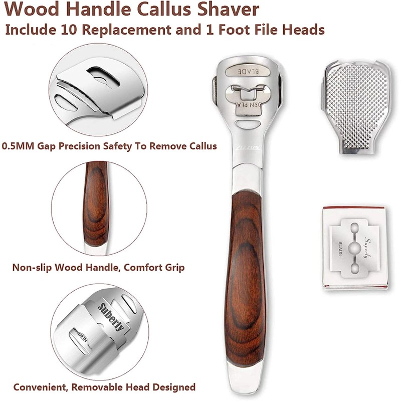 Wood Handle Callus Shaver: contains 10 Replacement & 1 Foot File Heads, 0.5mm gap precision and safety to remove callus, cracked, hard and dead skin on foot, removable head designed, very convenient to change, Solid wood handle provides most comfortable grip and smooth control.