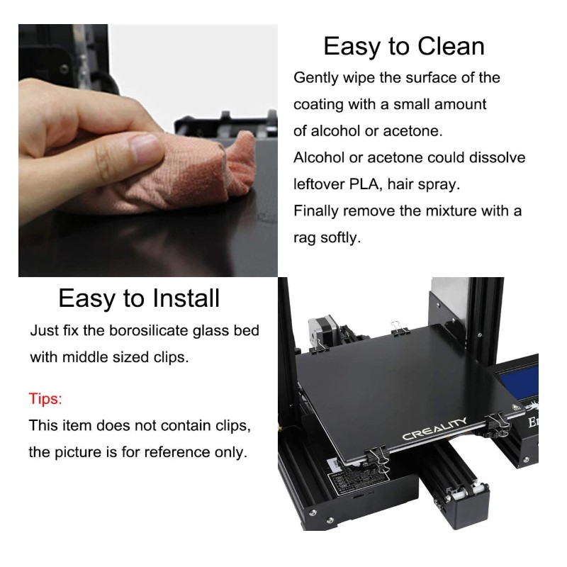 - Super Convenient: Very easy to take off the model, no tools needed; this borosilicate glass bed could be fixed with middle sized clips and cleaned with alcohol or acetone at room temperature