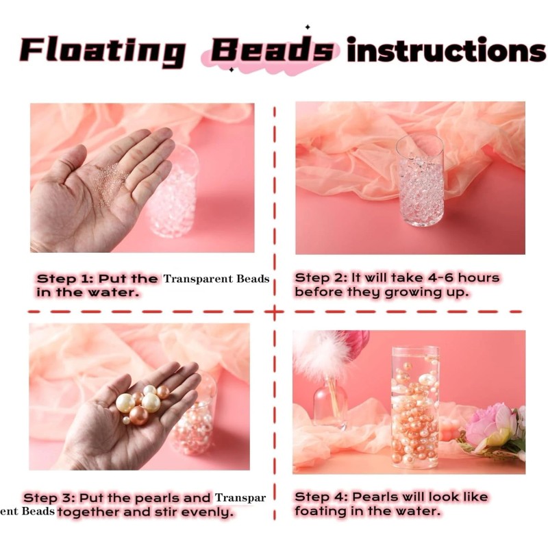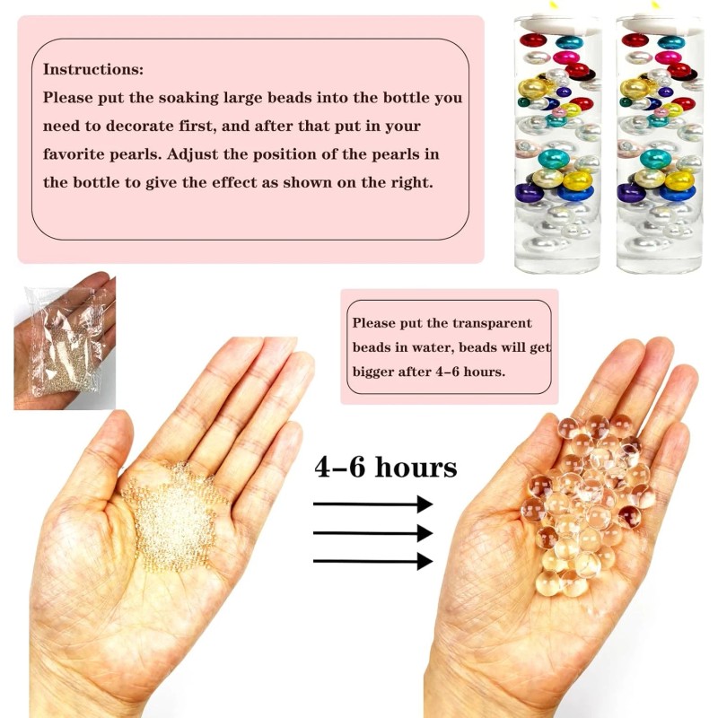 • 🌟Usage: No hole pearls cannot float in water. Please use the beads in the small bag we provide as a support. After enlarging the beads in the small bag, please put your favorite pearls into a vase or any container you like.