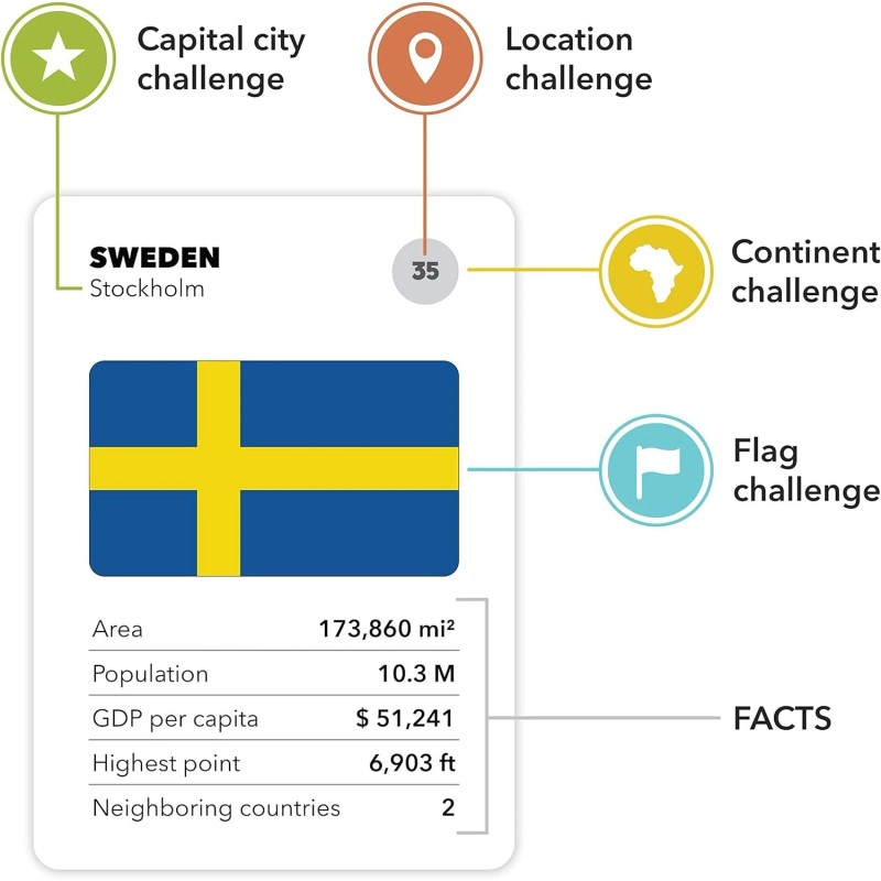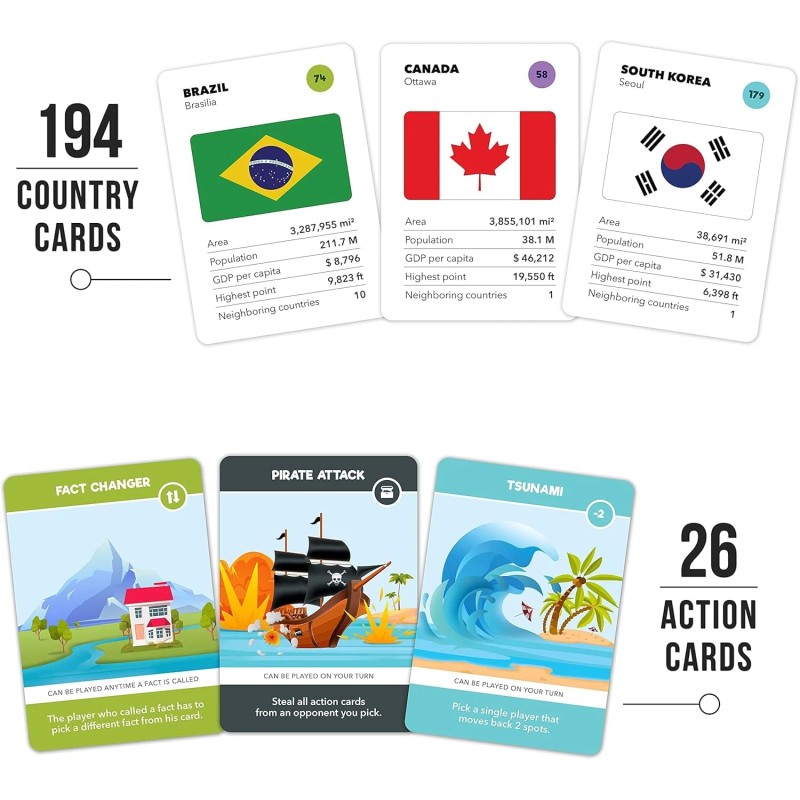 There are 194 world country cards. Each card contains 5 facts about the country like area, population, GDP per capita... Kids will soon know more about geography than you do. Suitable both for beginners and geo geeks.