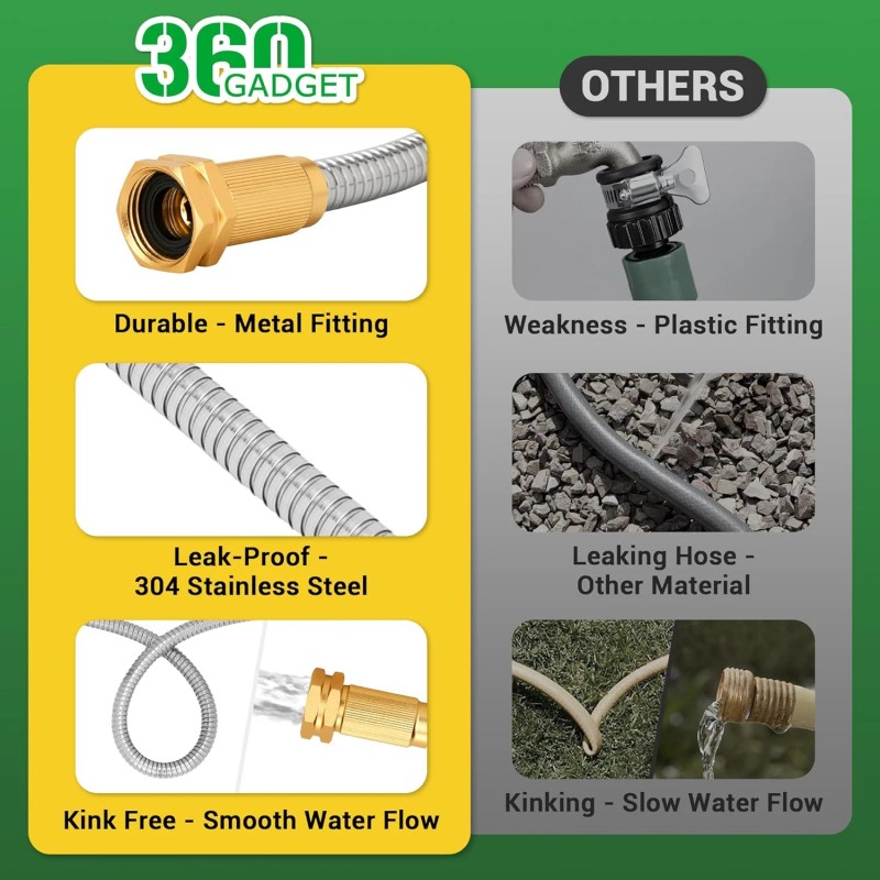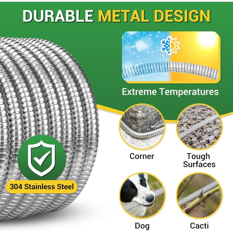 - 【Durable Metal Design】: Crafted with 304 stainless steels, 360 GADGET short garden hose is leak-proof, puncture-resistant, and can endure harsh environments. Its resilient design prevents damage from pet bites and remains durable in extreme temperatures, ensuring it won't become brittle in the cold or melt in the heat. Experience a reliable, long-lasting water hose that simplifies your gardening without the worry of frequent replacements. Perfect for every garden task.