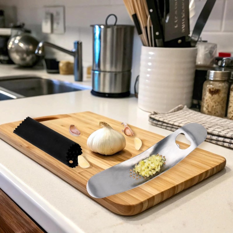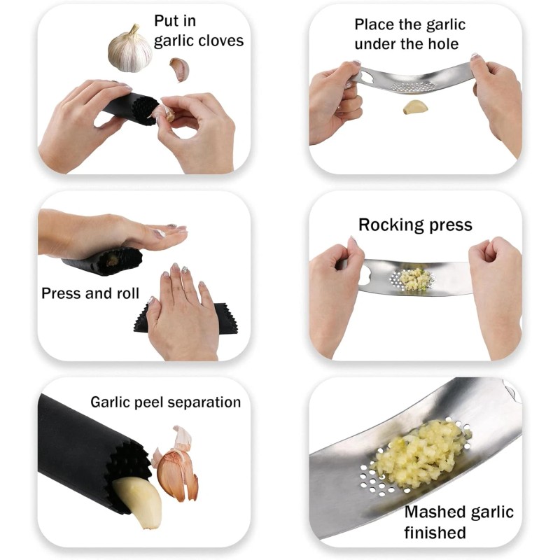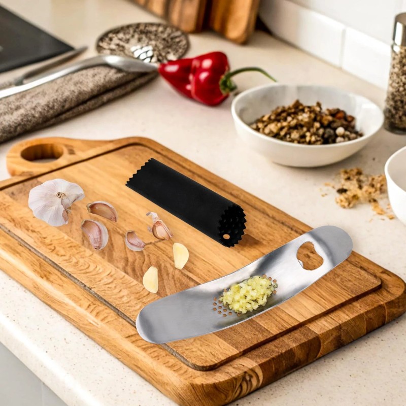 Make garlic preparation easier with this garlic press rocker and peeler set, designed for daily cooking needs.