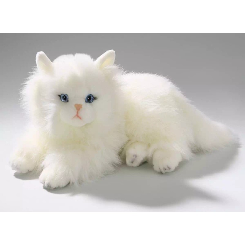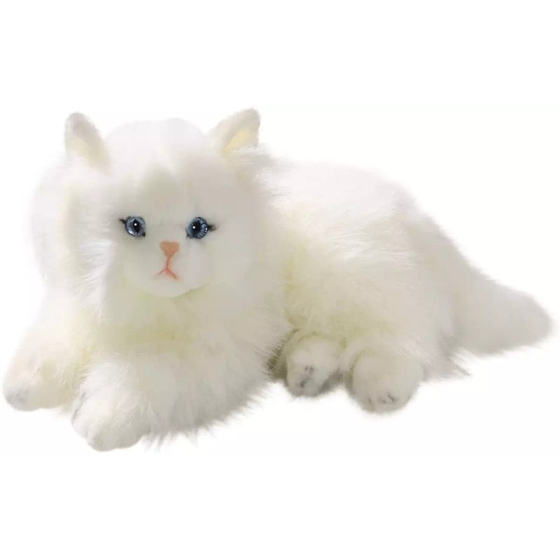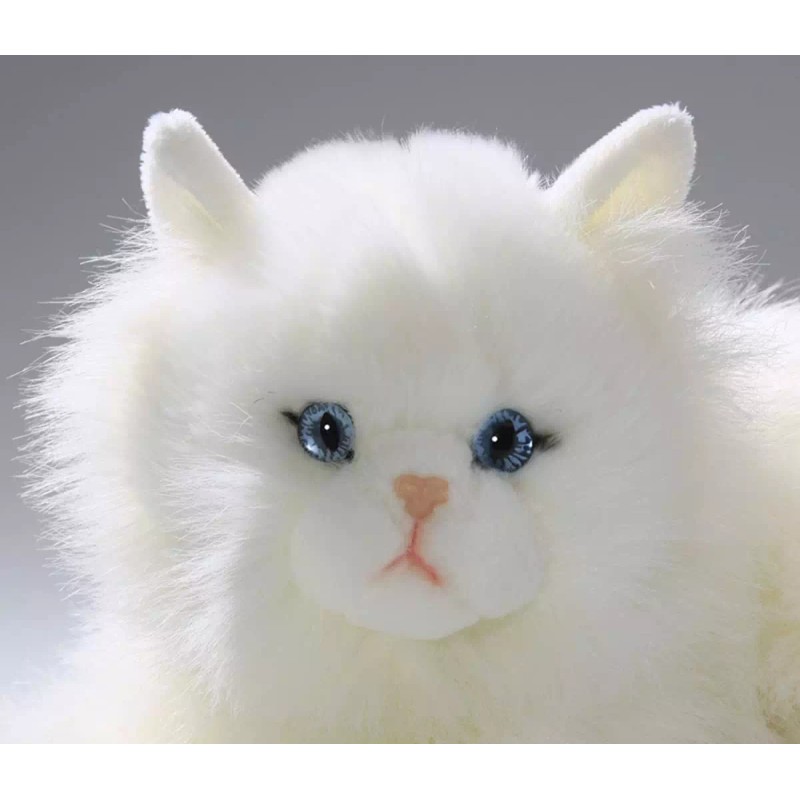 El pelaje del gato de peluche es de color blanco brillante. El color de los ojos de seguridad es azul.