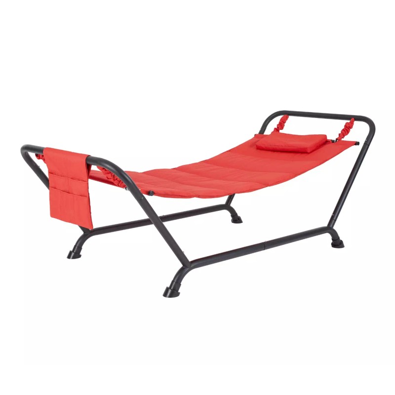 ✅ This one-person hammock can support up to 250 pounds. ✅ Constructed with a rust-resistant powder-coated steel frame with a matte carbon finish. ✅ Designed with a hanging pocket to keep your favorite reading materials and other items within reach. ✅ Comes with a matching pillow for enhanced comfort. ✅ Easy to assemble with the included instructions. ✅ Available in red. This sturdy hammock is crafted with a matte carbon powder-coated steel frame and has been tested to hold up to 250 pounds. The padded hammock is wrapped in 100% polyester, making it easy to care for. Designed with a hanging pocket to keep your favorite reading materials and other items within reach, the hammock with stand comes with a matching pillow for enhanced comfort and is easy to assemble with the included instructions. This hammock with stand is a good place to release pressure and relax. It is sturdy and easy to assemble.