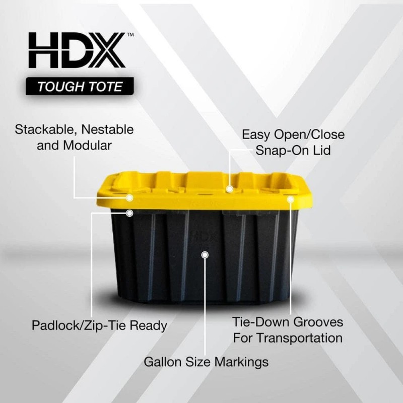 This heavy-duty HDX 7-Gallon Tough Tote is designed to handle all your storage needs. The recessed lid enables you to stack multiple units effortlessly, while the tapered design facilitates easy nesting when you need to store them. With a sturdy black base crafted from high-grade resin and a yellow snap lid, your items are safe and protected. Ideal for the thorough organizer seeking top-tier storage solutions, this tote features integrated slots for locking to deter unwanted access. Its unique tie-down channels also make it easy to secure for hassle-free transport and it's compatible with most hitch mounted cargo carriers. So that you can easily recognize what size your tote is, the gallon size is now clearly visible on both the base and the lid. Embrace the essence of organized living with HDX Tough Totes!