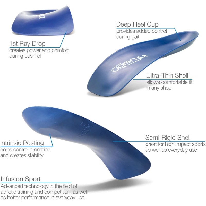 - SEMI-RIGID SHELL: These orthotics are the perfect balance between support and flexibility. The semi-rigid shell makes it your ideal companion for high-impact sports and your day-to-day life. Whether you use it for athletic activities or simply use it in your day-to-day, the Infusion Sport will enhance your comfort and performance, empowering you to conquer every challenge with confidence.