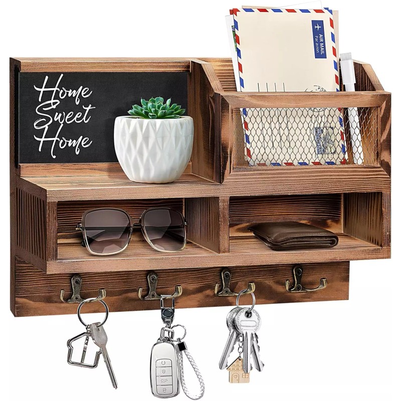 - Practical and Versatile: Wooden key rack contains 8 key hooks, 1 mail organizer, 2 storage boxes, 1 storage shelf, can easily keys, mails, wallets, glasses, put on small plants, knick-knacks, insert blackboard, mirror, greeting cards, photos in slot to decorate it; suit for your constant organizing needs, save much space and looks nice when hanging on the wall