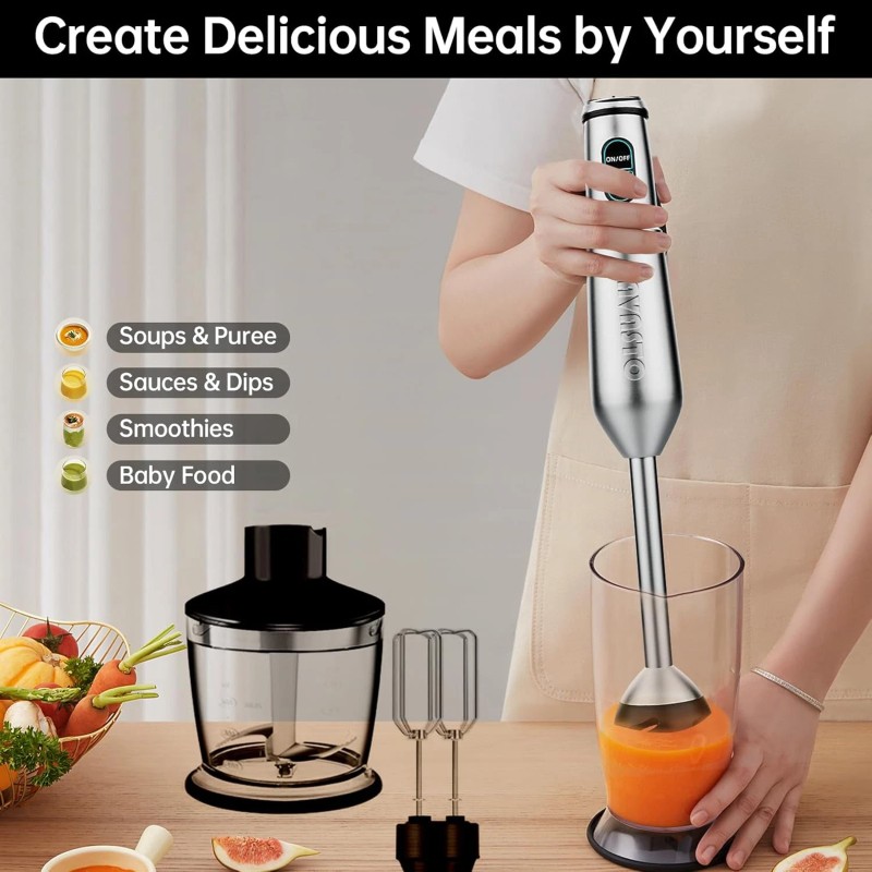 • ALTA POTENCIA Y CUCHILLAS EXCLUSIVAS GARANTIZAN RESULTADOS SUAVES Y CONSISTENTES: Los batidos saben mejor al añadir cubitos de hielo y frutas congeladas. Por eso, nuestra batidora de inmersión cuenta con distintivas cuchillas de acero de titanio de 4 puntas con diseño curvo y un potente motor de 1000 vatios que ayudan a mezclar ingredientes duros y ofrecer resultados consistentemente suaves.