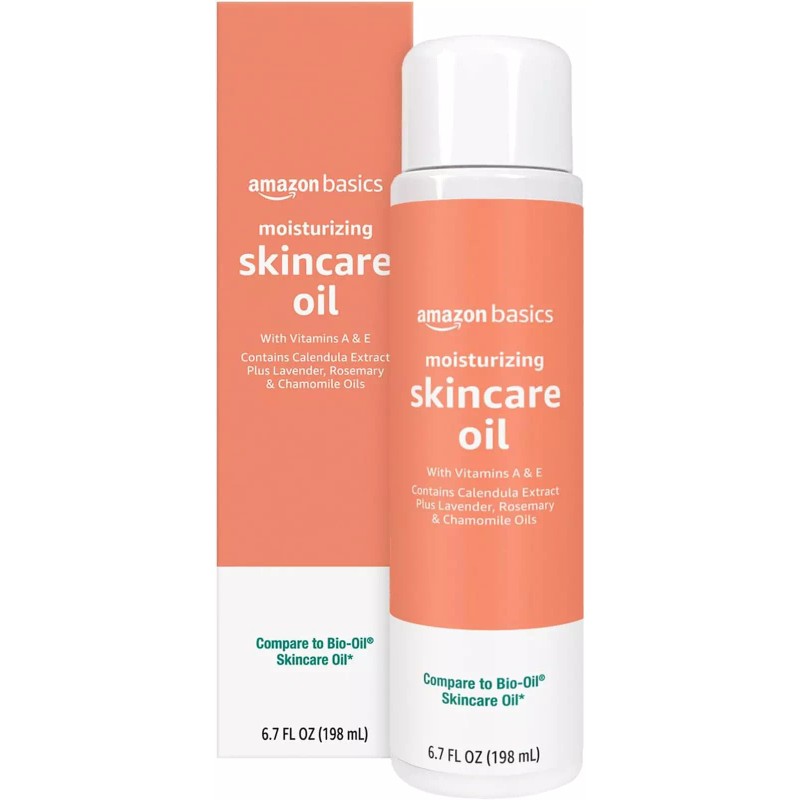 Amazon Basics Moisturizing Skincare Oil, enriched with Vitamins A and E, combines hydrating oils and skin-conditioning ingredients to nurture and pamper your skin. Infused with soothing calendula, lavender, rosemary, and chamomile oils, it provides antioxidant support with Tocopheryl Acetate for a calming, moisturizing experience.