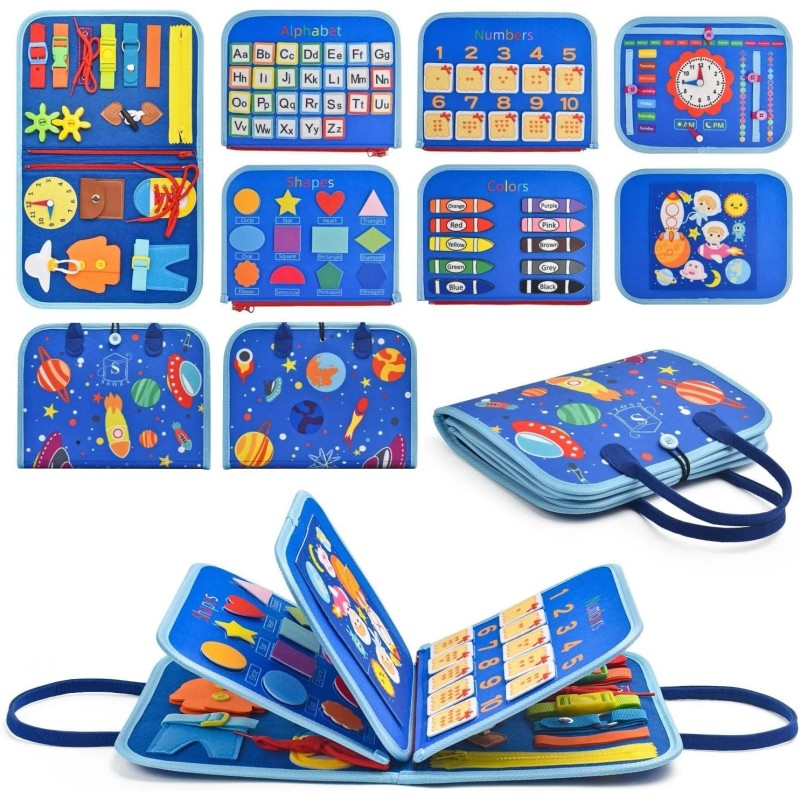 1. Includes zippers, buckles, pocket snaps, shapes, puzzles, alphabet, numbers, and colors;