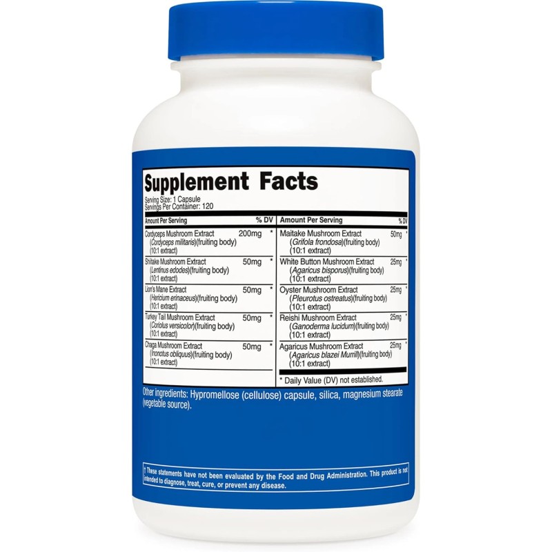 Nutricost's Mushroom Complex contains 5,500mg equivalent of a mushroom blend made up of 10 different mushroom varieties, including Cordyceps, Shiitake, Lion's Mane, Turkey Tail, Chaga, Maitake, Enoki, Oyster, Reishi, and Agaricus mushrooms.