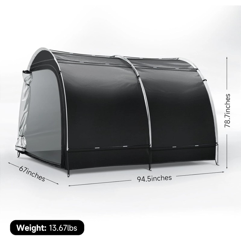 - 【New Upgraded Materials】The outdoor bike storage tent is crafted from 210D silver-coated Oxford cloth, featuring triple-layer rip and tear-resistant fabric with a PU 5000 waterproof coating. Bike tent offers superior protection, preventing equipment aging. All seams are sealed with waterproof tape, all zippers are equipped with waterproof strips to prevent rainwater penetration, enhancing overall waterproofing, ensuring durability even in harsh conditions.