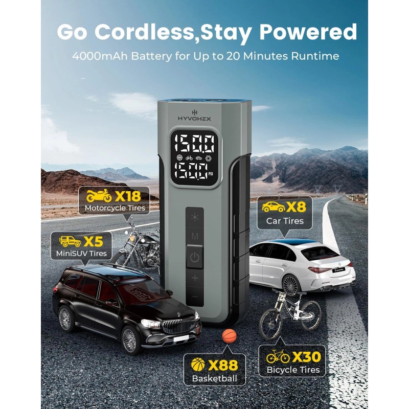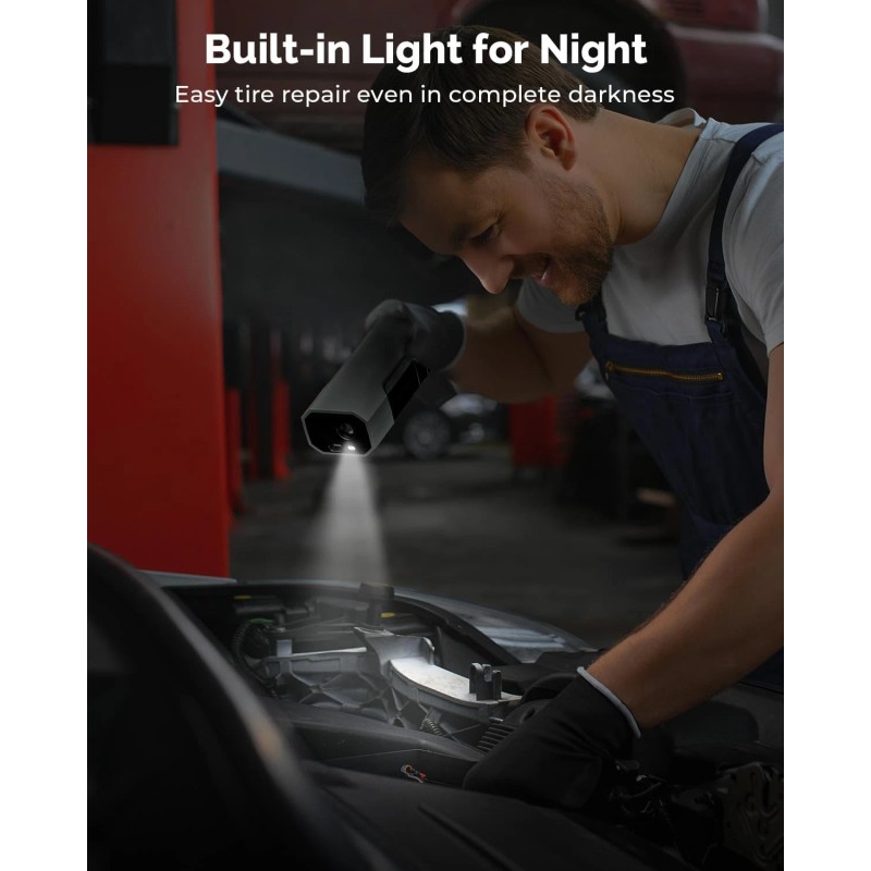 Rechargeable & Portable: Powered by a 4000mAh rechargeable battery for extended cordless operation. Built-in LED light offers visibility for nighttime or roadside emergencies.