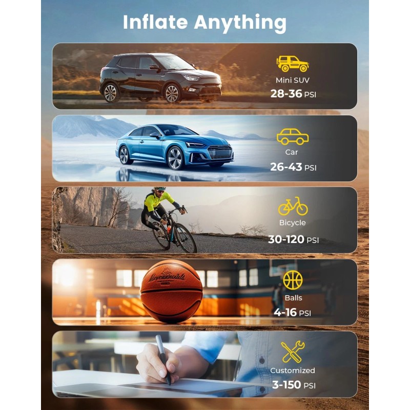 Smart Inflation Modes: Choose from 4 preset modes—Car, Bicycle, Ball, and Custom—for precise inflation. Auto shut-off stops inflation at the preset pressure to avoid overinflation.