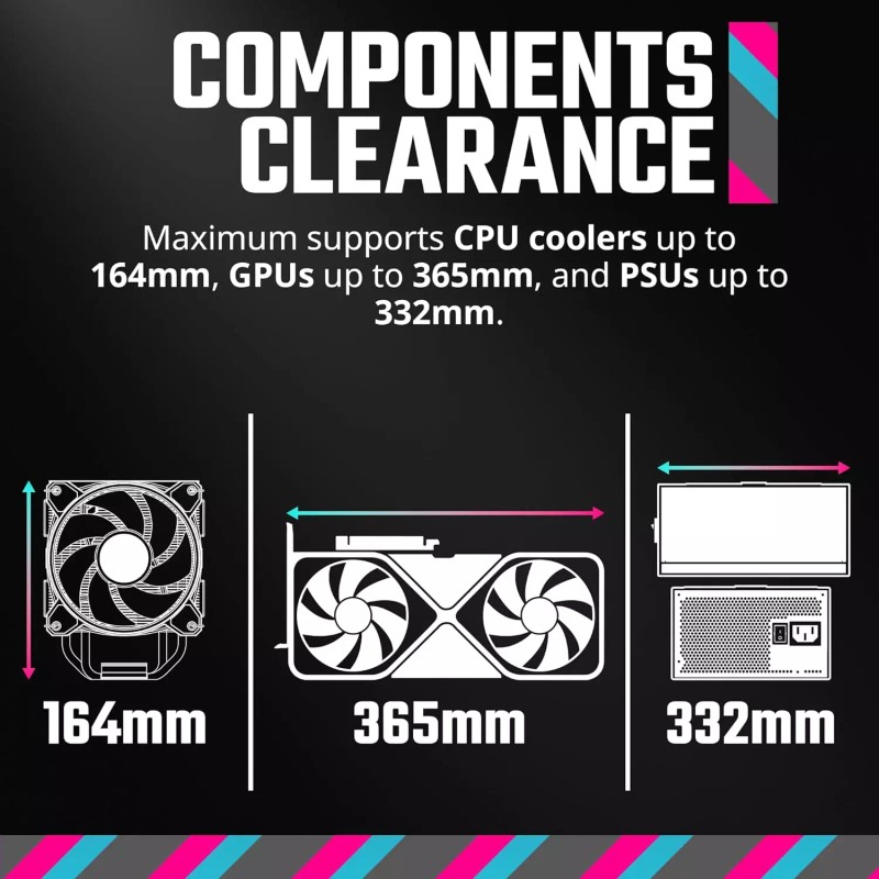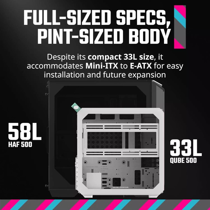 - Full-Sized Specs, Pint-Sized Body: Despite its compact 33L size, the Qube 500 can accommodate EATX motherboards, the latest GPUs, and even dual 280mm radiators.