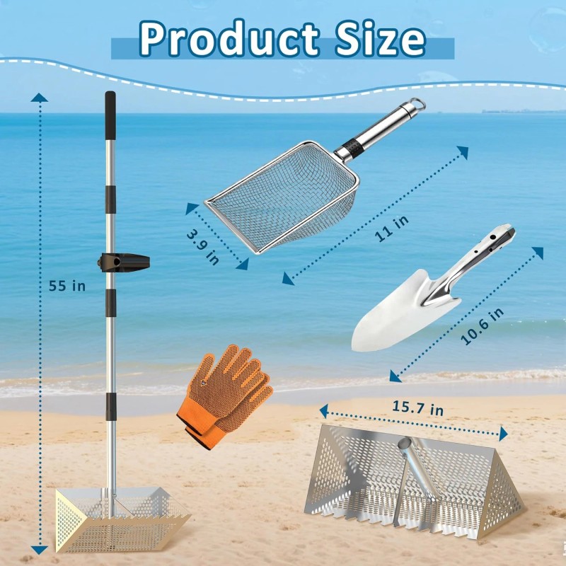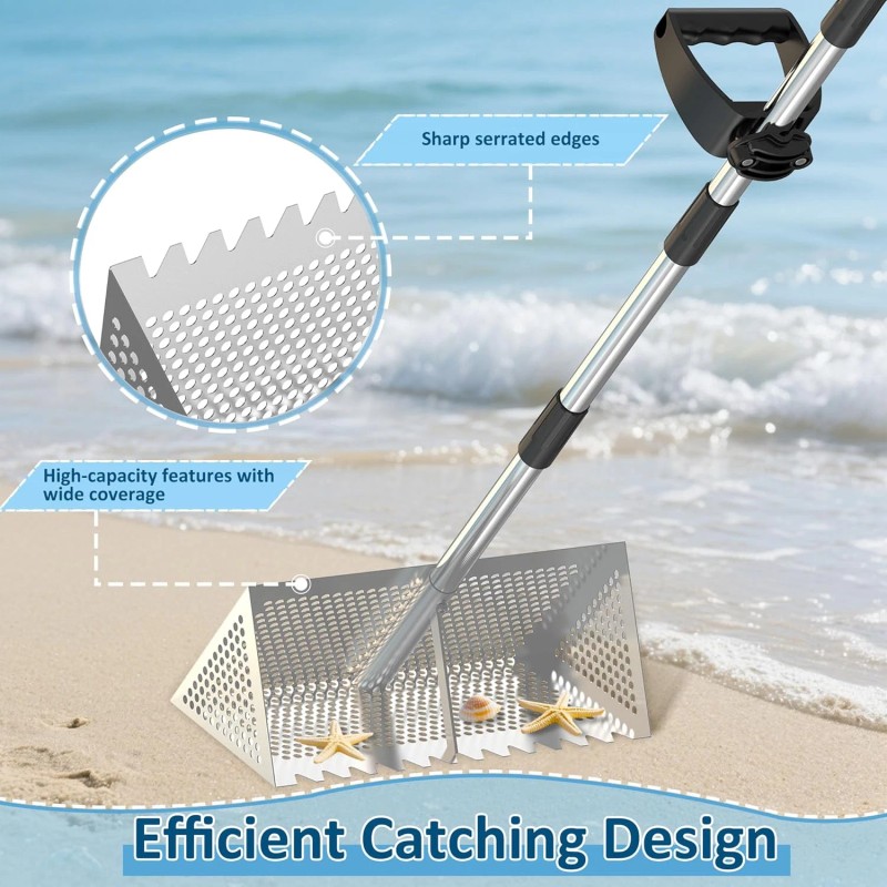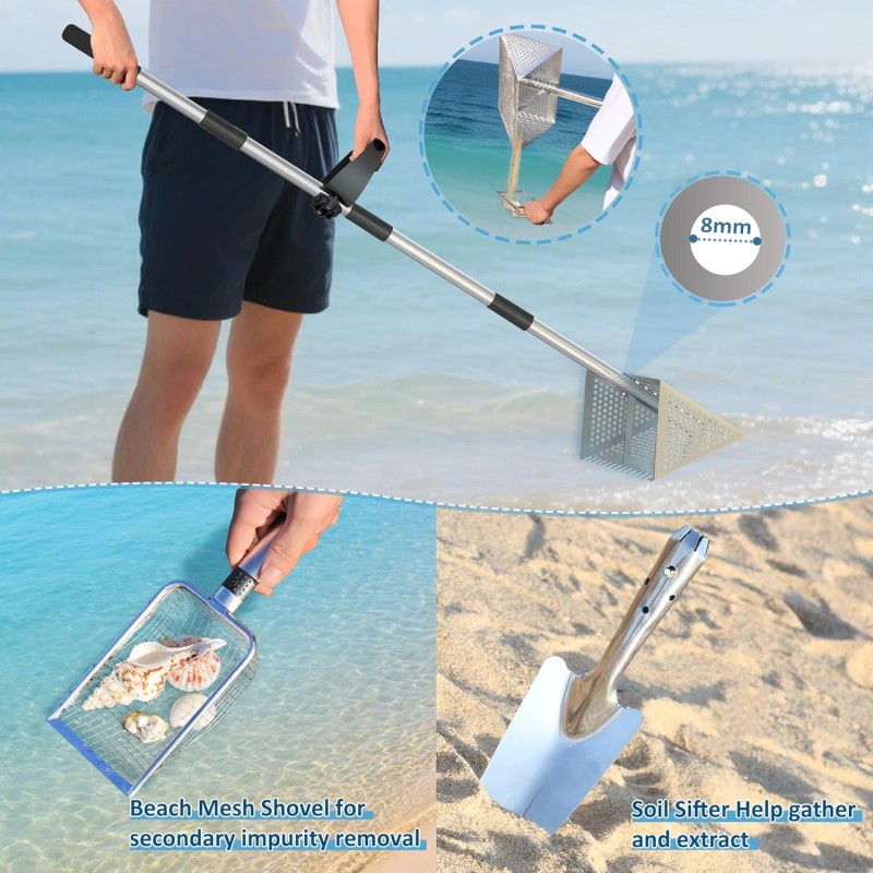 - 【EFFICIENT COLLECTION】Sand Flea Rake is a tool for collecting sand fleas, shark teeth, and shells; the digging-friendly sharp teeth are designed to allow you to dig deeper into the sand to collect more than one at a time, faster and more efficiently than by hand. This package includes a rake, a detachable pole, an auxiliary handle, a beach mesh shovel, a soil sifter, a pair of gloves and some screws.