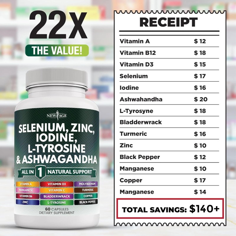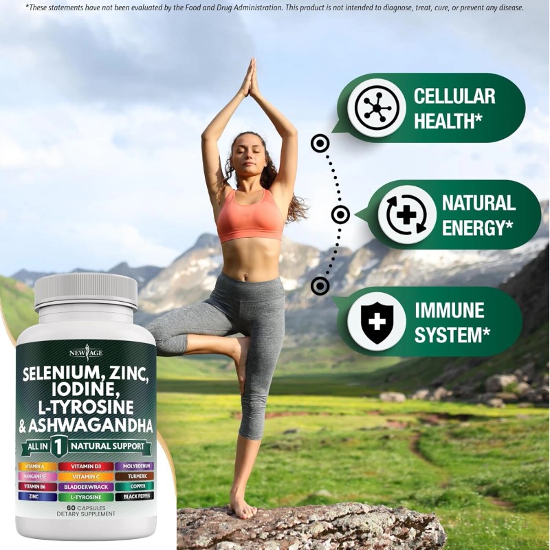 - The Powerful Thyroid Complex & Iodine Supplement You've Been Searching For - New Age Thryroid blend combines five potent products into a single thyroid support formula.It includes a complete zinc supplement, iodine for thyroid health, selenium, tyrosine powder, and ashwagandha, all in just two easy-to-take capsules. Also iodine pills, 50 mg of zinc, and ashwagandha are conveniently packed into one comprehensive solution.