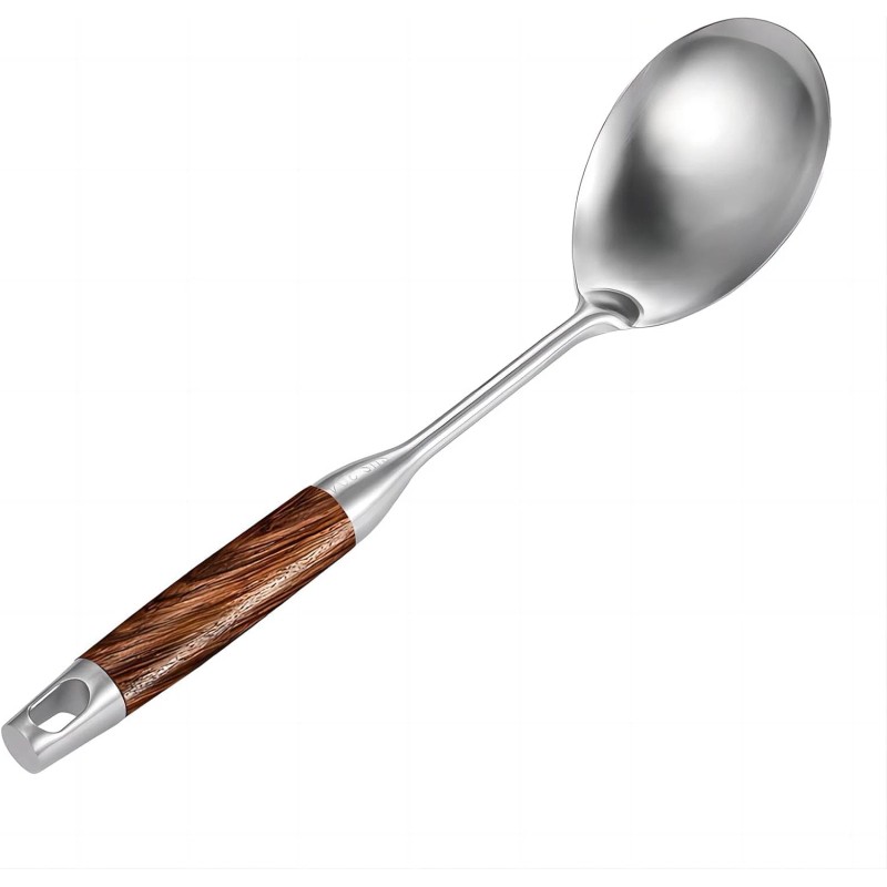 This solid cooking spoon is designed with an ergonomic handle to aid in your kitchen work. Hand-forged from a single piece of heavy duty stainless steel body with flower Pear wood handle to insulate from heat,Anti-hot hand.Its comfortable handle and easy grip will make it your go-to kitchen spoon, while its handy hook will enhance your kitchen décor.