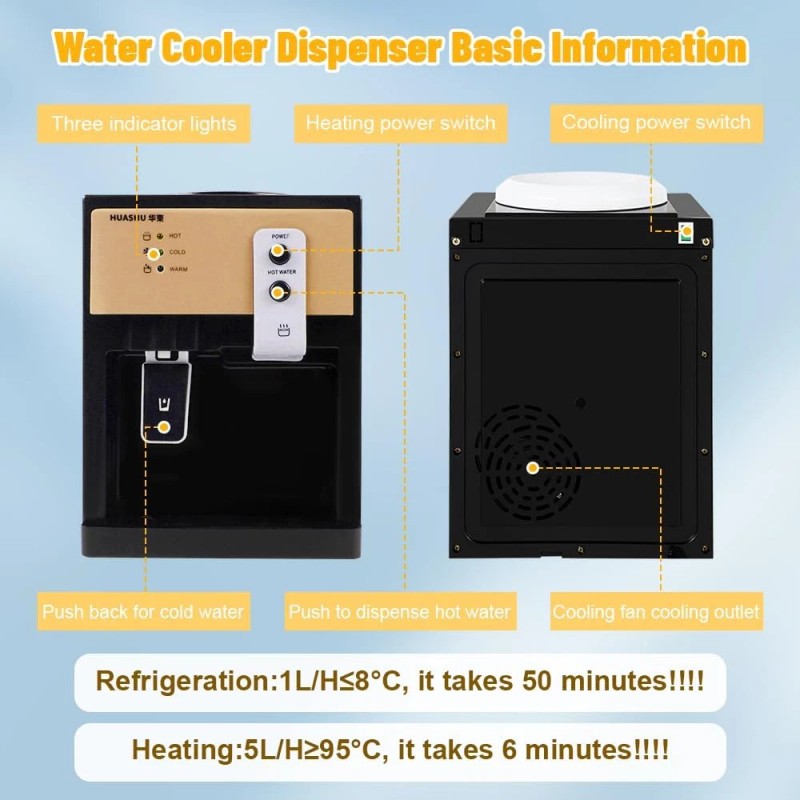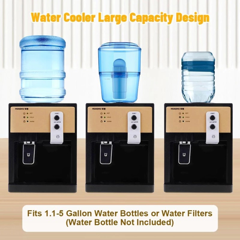 - 【Applicable Scenarios】The cooler dispenser is small in size,compact in design and takes up no space,suitable for any desktop,and can be placed on desks,bedside tables,coffee tables,etc. Table top water dispensers it fits 3-5 gallon water bottles(not included),can be used in any season,ideal for your bedroom,studio,office,grocery shop etc.