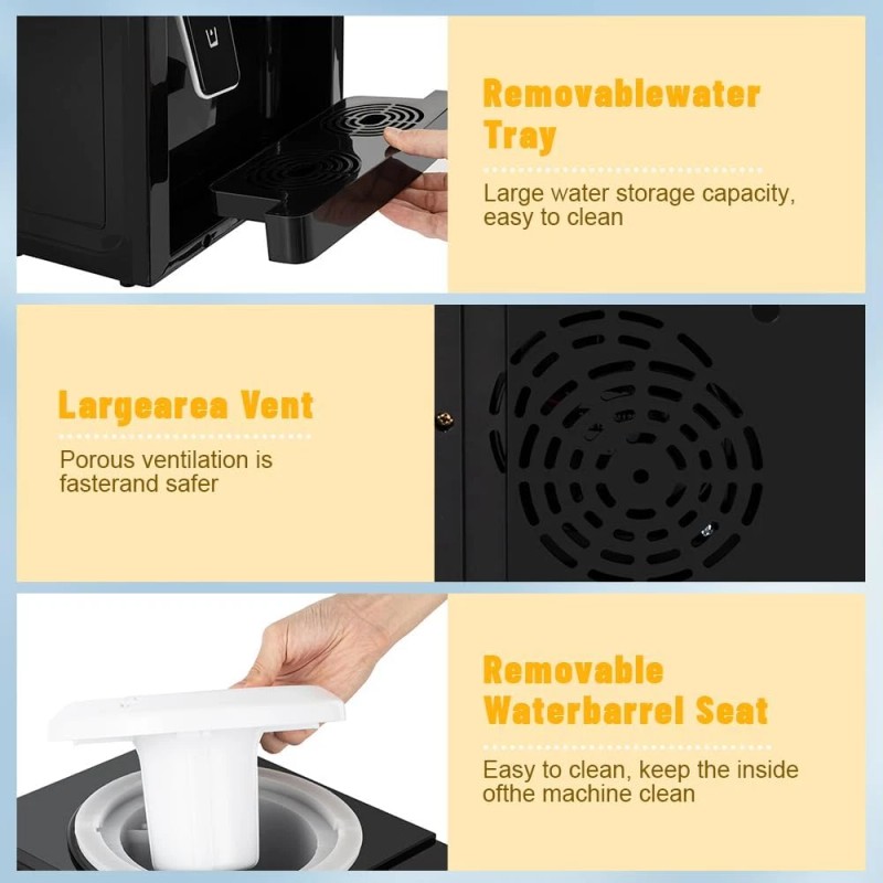 - 【Top Loading Water Dispenser】Hot cold water dispenser can easily hold 3.5/5/10/18.9L(0.77/1.1/2.2/4.2GAL) water bottles or jugs with large capacity.This water dispenser table top is small in size, 10.8*9.45*14.2 inches. 9.45*14.2 inches. You can visually see how much water is left in the bottle, which is convenient for you to change and maintain the water dispenser.