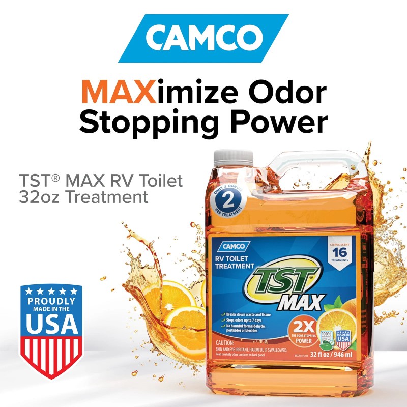 Keep your black tank fresh and clean with TST MAX Citrus Toilet Treatment. This product is specially designed to eliminate odors, break down waste, and ensure top performance in RV and marine tanks. TST Max liquid treatment is designed to be safe for your septic tank and the environment. The ultra-concentrated formula offers a sustainable solution for your toilet treatment needs. With just a 2-ounce application, you can keep up to a 40-gallon tank smelling fresh for seven days. Trust -made TST MAX Citrus Toilet Treatment for an odor-free tank on all your adventures. Color: Orange; Model#: 41192.