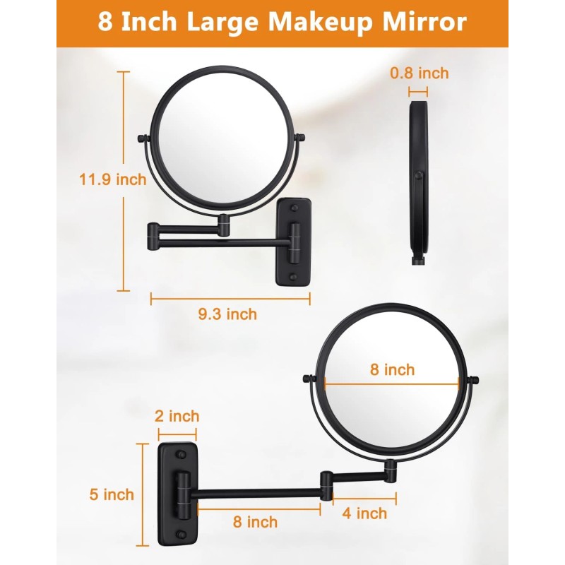 - 8 Inch Large Size & 360° Rotatable - This vanity mirror is upgraded 8 inch larger size, providing a large and high-definition wide-angle field of view. It can be rotated 180 degrees within the frame and 360 degrees on both extending arms. You can adjust the mirror to any angle and position you need.
