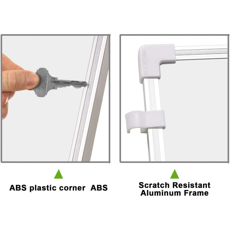 - Double sided magnetic whiteboard for kids, sliver aluminum frame with ABS round corners.