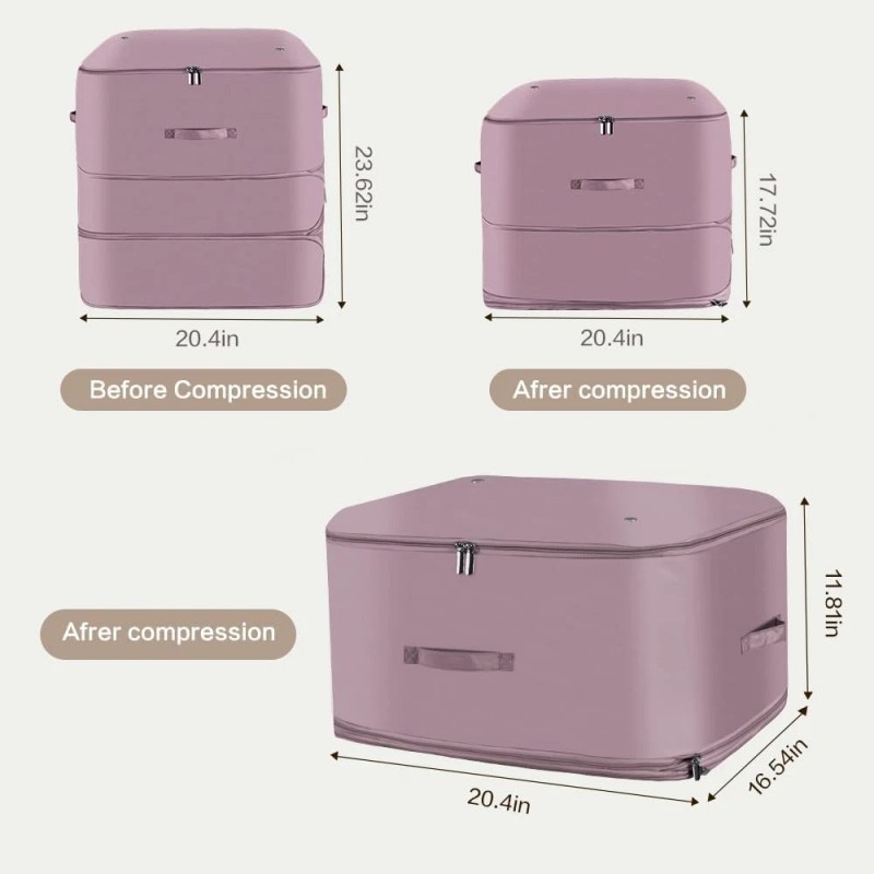 • All-Purpose Storage Organizer Perfect as space-saving storage totes for dorm rooms, garment bags for delicate dresses, or moving bags for blankets. The dimensions of the compression bags are 21.6 inches (compressed: 10.6) x 16.5 inches x 20.4 inches