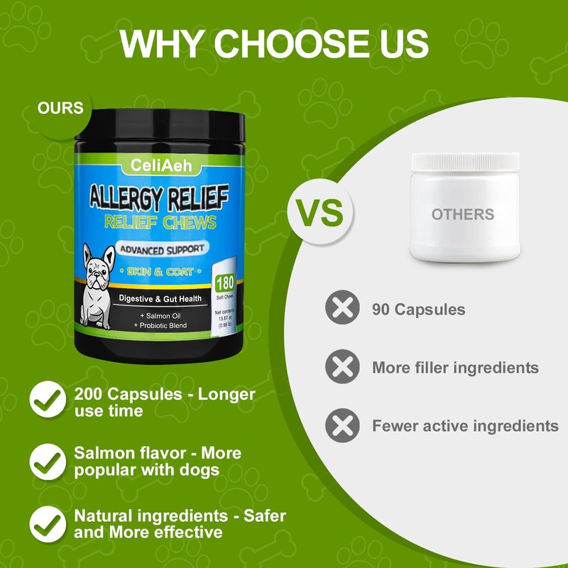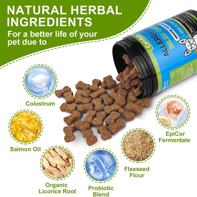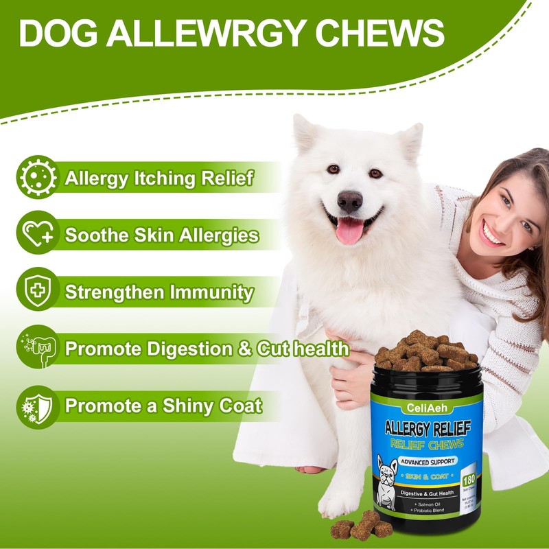 - Effectively Allergy Relief in Dogs: Our dog allergy chews offer comprehensive support against environmental pollutants, food, and seasonal allergies, reducing symptoms like paw licking and itching. allergy chews for dogs reduce itching, relieve dog allergy, and keep dog comfortable. Allergy immune bites for dogs strengthen pet's immune system, provide itch relief for dogs, prevent dog food and seasonal allergies, and relieve symptoms such as paw licking, itching, bald spots, rashes, and hot spots