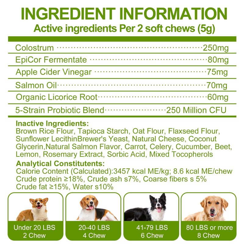 - Natural Safe Ingredients: Our pet allergy chews are packed with natural and safe ingredients to support dog seasonal allergy relief. These dog anti-itch chews contain turmeric, colostrum, salmon oil, probiotics, omega-3 fish oil, coconut oil, and more in a gentle, pet-friendly formula. These skin supplements for dogs protect your dog from skin allergies and provide comfort