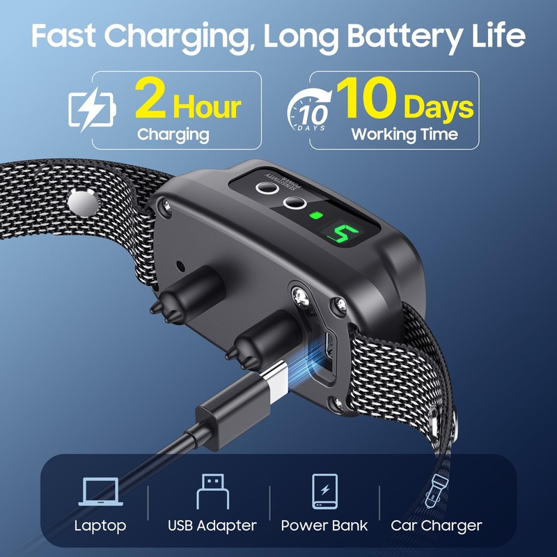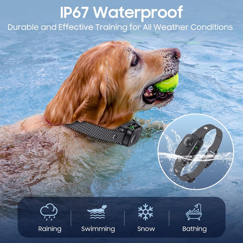 - 【Rechargeable & IP67 Waterproof】this dog bark collar only takes 1-2 hours to fully charge and can work for about 15 days.Futhermore,The no bark collars is made with water-resistant materials and sealed components, protecting its interior from moisture damage. With this anti bark device's IP67 waterproof rating, your dog can enjoy bathing, swimming, chasing toys around the pool, or playing in the rain. It can be used for both indoor and outdoor.