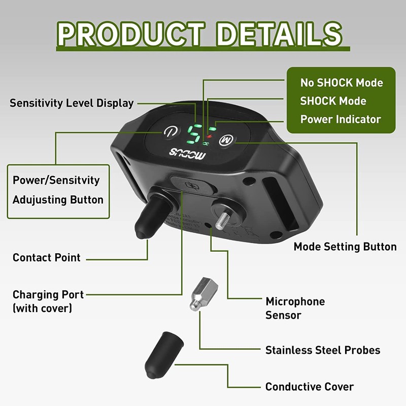 - Smart Interference and Workflow - The dog training collar is equipped with a sophisticated trigger sensor that only activates when your dog barks but does not make any false triggers such as barking from other dogs. The anti-bark collar activates faster and more effectively without any delays or additional hassles. Set the modes with the Mode Button and change the sensitivity levels from 1 to 5 with the Power Button, depending on the environment, to automatically help you train your dogs