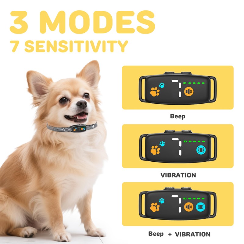 - Three anti barking modes of the collar - Three modes of beep, vibration, and beep + vibration, suitable for different dog breeds and scenes. Our dog shock collar adopts dual sensors of MIC and AFT, with sensitivity adjustment ranging from 0 to 7 levels, accurately identifying dog barking and automatically triggering intervention to reduce false alarms. The shock collar for dogs adopts a progressive intervention strategy, with the intervention duration gradually increasing (0.8 seconds to 4.0 seconds) to avoid pet stress reactions.