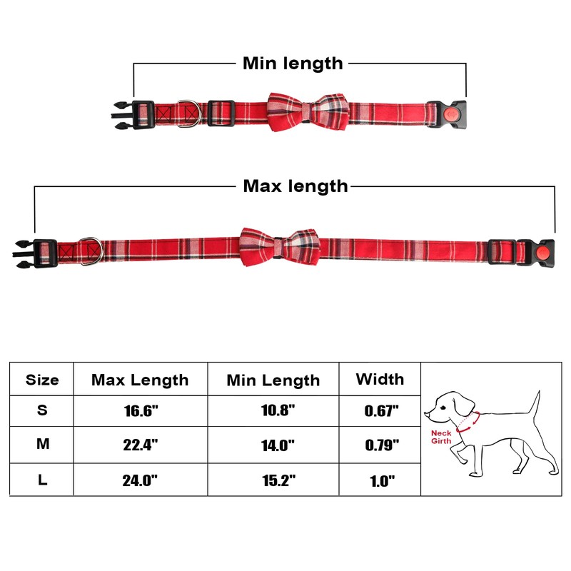 - ADJUSTABLE NECK SIZE DOG COLLAR: Dog collar is a classic yet stylish collar that comes in 5 colors and 3 sizes.Adjustable collar buckle, Small: Max Length:16.6" ; Min Length:10.8";Width:0.67"; Medium: Max Length:22.4"; Min Length:14";Width:0.79"; Large: Max Length:24", Min Length: 15.2",Width:1". Note: Please make sure check your pet's neck girth before purchasing this bowtie collar.