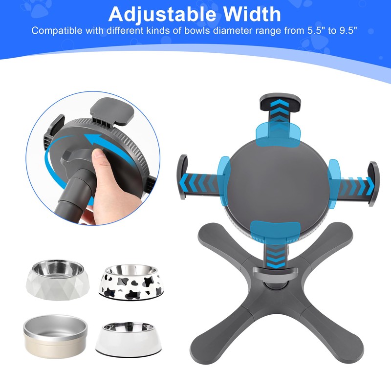 - 【Bowl Width Adjustable】The raised dog bowl stand is adjustable in width to easily accommodate bowls of all shapes.Most raised dog bowls on the market can only be adjusted for height.But our KMXASP multifunctional dog bowl stand offers an additional feature of adustable width.It can be freely rotated and extended outward by 5.5 to 9.5 inches. It is extremely flexible and ensures that every furry dog can enjoy their meal in comfort. It allows dog owners to easily accommodate dog bowls of all shapes and sizes, making it convenient for those who have multiple dogs with different feeding needs