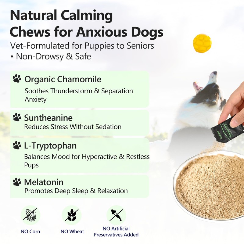 - Gentle Anxiety Relief for Nervous Dogs: This calming powder helps dogs feel more relaxed during stressful situations like thunderstorms, fireworks, or vet visits. The natural formula works to soothe anxious behaviors including excessive barking or restlessness without causing drowsiness.