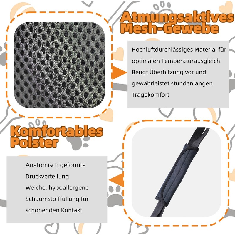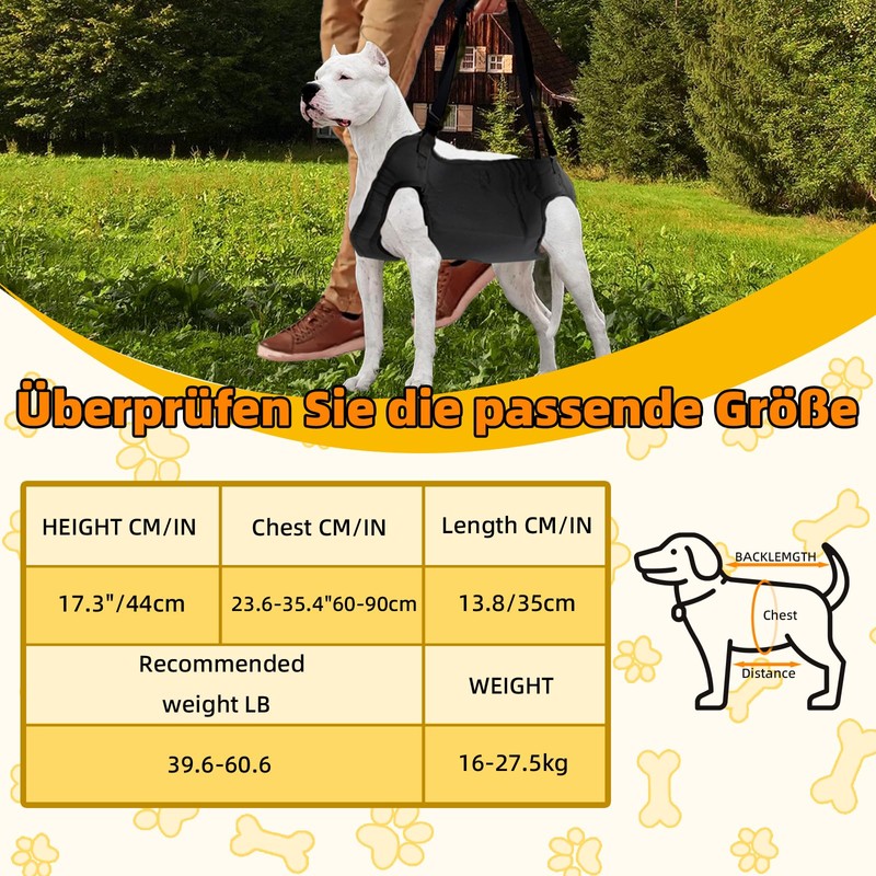 • Pressure compensation technology for long-term wear 6-zone pressure distribution: 5 cm chest & 7 cm belly straps with memory foam stop constriction. Non-slip silicone strips & adjustable leg loops stabilise dogs with HD (hip dysplasia).