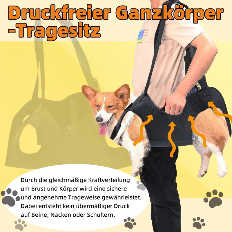 • Carry system with handles for comfort and control. Multiple non-slip carrying handles (anatomically shaped) for safe lifting when climbing stairs or car transport. Adjustable shoulder and waist straps distribute the weight of the dog evenly - protects your back!