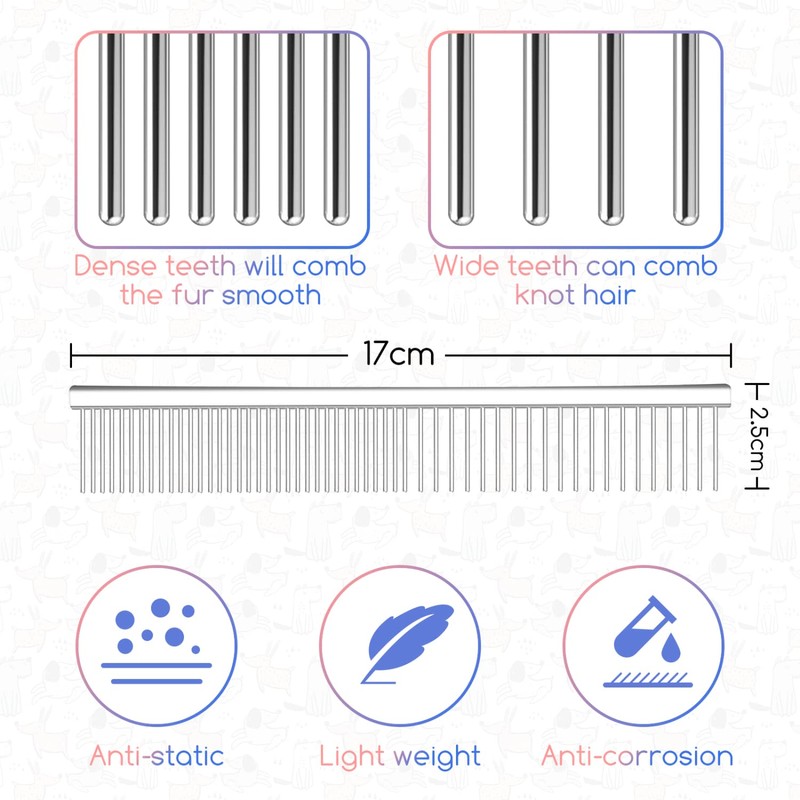 - ★ 2-in-1 design with wide and dense pins: the dense pins can comb the fine hair on the eyes, nose, ears and legs, while the wide pins can loosen matted hair and fluffy hair, which is suitable for styling pets.