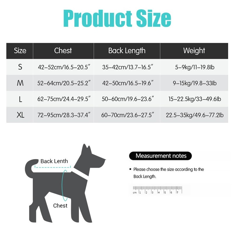 2.Adjustment Buckle: The buckle can be adjusted according to the size of the dog's chest and back. It will not limit the dog's activity when they run and play. Before buying, please measure the dog's neck, chest, and back length, and then choose the appropriate cool clothes.