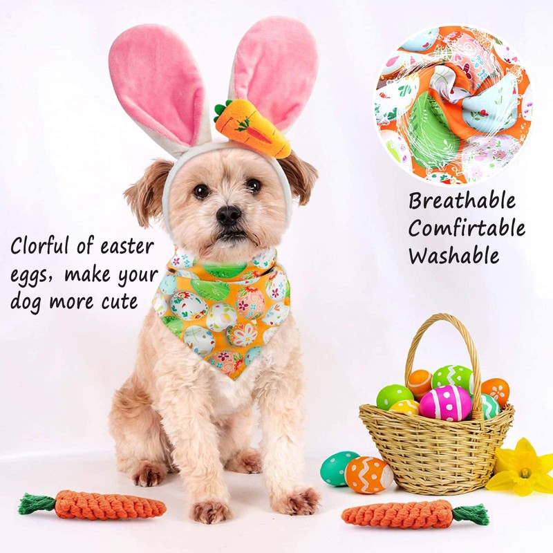- 👍Soft and Reliable Material:The Easter eggs pattern puppy bandanas, machine washable, premium polyester fabric that is breathable and comfortable to wear. Rabbit ears for dog with a carrot is made of soft & lightweight short plush provides a great deal of comfort.