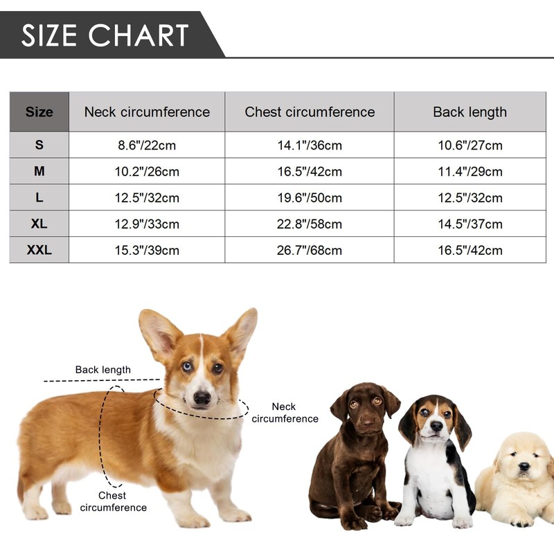 The suit has 5 sizes for you to choose, fits for most of dogs.